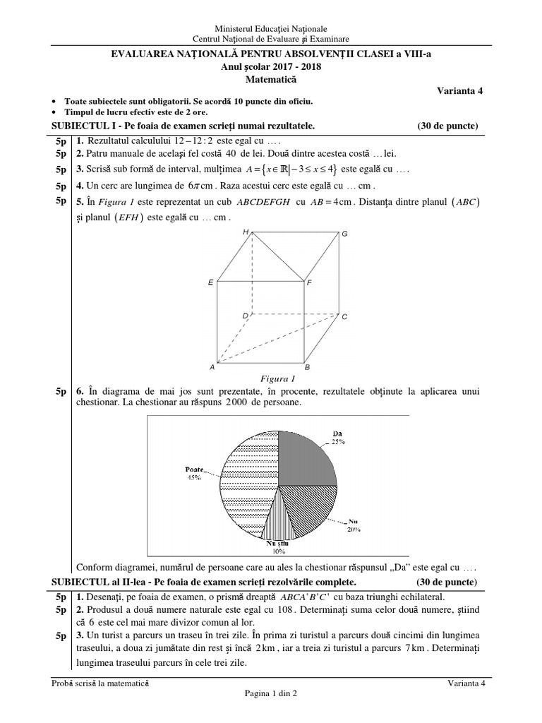 Evaluare Naţională Matematică 2018 Subiecte Si Barem La Proba Scrisă Matematică Informaţiile Au Fost Publicate Pe Edu Ro