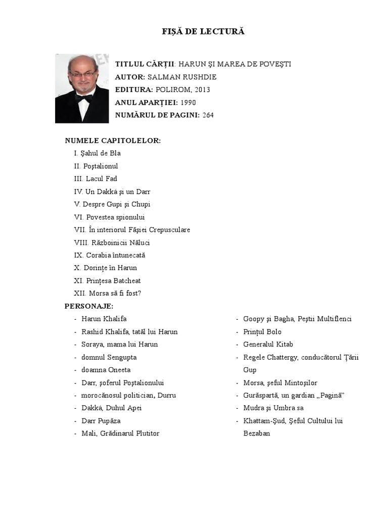 Fisă De Lectură Harun Si Marea De Povesti