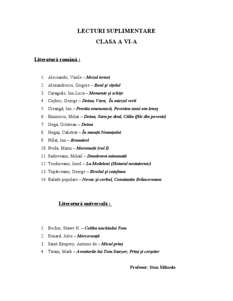Lecturi Obligatorii Pentru Clasa A Vi