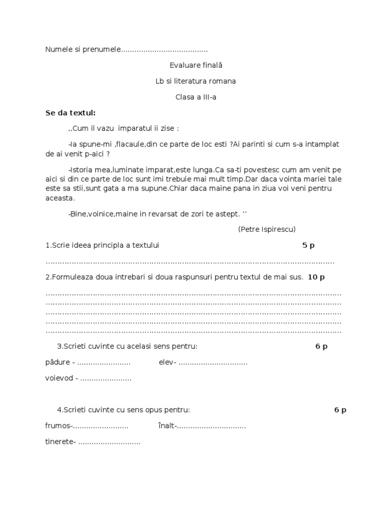 Evaluare Initiala Limba Romana Cls Iii A Test